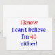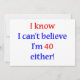 I know, I can't believe I'm 40 either! Humourous design for the 40 year old who knows they don't look 40. Makes a great 40th birthday gift.