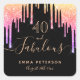 A trendy and glamourous 40th birthday sticker. A classic black background decorated with rainbow coloured faux glitter drips, paint dripping look in purple, pink and rose gold. With the text: 40 and fabulous. Personalise and add a name and a date. Date of birth or the date of the party. Golden coloured text. The word Fabulous is written with a modern hand lettered style script with swashes.