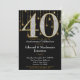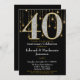 An elegant 40th anniversary party invitation in black and gold, featuring a large 40 with diamonds and gold appearance along with a glittery curtain of gold lights.