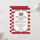 Ruby red 40th wedding anniversary party invitation. Elegant red, black white invite card with faux glitter gold. Features stylish stripes and script font. Perfect for a 40th anniversary celebration.