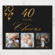 A bottle label for a 40th birthday party. Personalise and add 3 of your own photo from Your/her life, like friends, family, interests, dream goals, pets, age 40 and a date. Date of birth or the date of the party. Golden coloured letters. The word: Cheers, in faux gold written with a trendy hand lettered style script. Elegant, classic chic black background colour, decorated with faux gold party streamers.