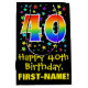This colourful, fun, and vibrant birthday giftbag design features a large number "40" with a rainbow spectrum gradient style pattern, along with the message "Happy 40th Birthday,", and a personalised recipient name. It also has a colourful background pattern featuring star shapes of various sizes. A birthday themed gift bag like this might be used when giving a gift or present in celebration of somebody’s fortieth birthday. [~Z0000510]
