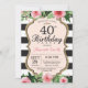 40th Birthday Invitation for women. Black and Gold Birthday Party Invite. Gold Glitter. Pink Watercolor Floral Flower. Black and White Stripes. Printable Digital. For further customisation, please click the "Customise it" button and use our design tool to modify this template.