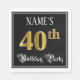 This ornate and opulent birthday themed paper napkin design features a customizable name and the message “40th Birthday Party”. The large number “40th” has an imitation/faux gold-inspired coloring pattern, and the words “Birthday Party” are in luxurious script-style text. The background is colored black by default (although it can be customized). Luxurious, elegant paper napkins like this might be useful to have at a birthday party being held in celebration of somebody’s fortieth birthday. [~Z0000565]