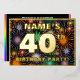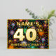 The front of this fun fortieth birthday celebration foil invitation card design features a custom name, a large number “40th”, the message “BIRTHDAY PARTY!”, and a border. The background of the front has an exciting, multicolored bursting celebratory fireworks-inspired pattern. The back features personalised details about the event, such as the date, time, venue/place, and any other information that may be useful. Customisable invitations like these might be a fun way to invite guests/attendees to a birthday party being held to honour somebody’s 40th birthday. [~Z0000602]