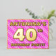 The front of this joyful and upbeat fortieth birthday celebration foil invitation card design features a customisable name, a large number “40th”, the message “BIRTHDAY PARTY!”, and a border. The background of the front features a loving dark pink and light pink striped pattern, with heart shapes. The back features personalised details about the event, such as the date, time, location/venue, and any other useful information. Editable invitations like these might be a fun way to invite guests/attendees to a birthday gathering/party being held to celebrate somebody’s 40th birthday. [~Z0000603]