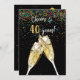 Champagne toast on black with colourful falling confetti for 40th birthday party invite.