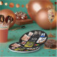 A paper plate for a 40 birthday party for a man, guy, celebrating his life with a collage of 8 of your own photos.  Templates the age 40 and a date.  Date of birth or the date of the party.  White coloured letters.  Black background.