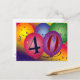 Easy to customise 40th birthday party postcard invitations. Colourful balloons with rainbow coloured background and confetti decorations.