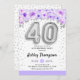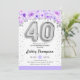 40th birthday party invitation. Elegant design in faux glitter silver with floral accent. Invite card with silver number 40 balloons, script font with confetti. Pastel purple, lavender and white. Perfect for a stylish fortieth bday celebration. Message me if you need custom age.