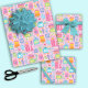 Fortieth birthday bright pink, blue, green, purple and orange party cake, presents and balloons. Each present has the number 40 the birthday person feel special. Other sweet stuff like butterflies, flowers, xo's, and hearts are added throughout the pattern. Pretty wrapping paper for an 40th birthday celebration.