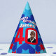Bright star patterned Personalised custom photo and name birthday party hat. Ideal for a special boys 40th birthday party celebration. Colourful red and blue star design. Background colour can also be changed for your own choice currently light blue. Original art and design by Sarah Trett. www.sarahtrett.com for www.mylittleeden.com