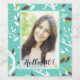 An elegant and modern botanical pattern of branches and leaves in teal green, brown and white as background. A slim white frame and template for Your photo. Black text overlay: Hello 40! A label for a 40th birthday party.