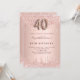 A modern, stylish and glamourous invitation for a 40th birthday party. A rose gold background with dripa, paint drip look. The name is written with a modern dark rose gold coloured hand lettered style script. Personalise and add your party details. Number 40 is written with a balloon style font, script.