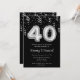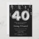 This elegant and glamourous birthday invitation features the number 40 in silver with silver confetti. The text combines handwritten script and modern sans serif fonts for a classy and sophisticated look.