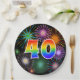 This cheerful, fun, and colourful paper plate design features a large number "40" coloured with a rainbow spectrum gradient inspired pattern. It also features a exciting and vibrant bursting celebratory fireworks inspired pattern. The background is coloured black. Fun paper plates like this might be used at a celebration being held to honour somebody’s fortieth birthday, a fortieth anniversary, or some other 40th event. [~Z0000490]