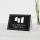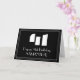 This vintage Roaring Twenties appearance inspired birthday themed greeting card design features a large art deco look inspired number "41", the message "Happy 41st Birthday,", a personalized name, and a border pattern consisting of thin lines on the front. The background of the front is colored black. The inside has a personalized birthday greeting message, or could perhaps be cleared and left blank if a message is to be written by hand instead. A personalized birthday greeting card like this might be used to acknowledge somebody’s forty-first birthday. [~Z0000486]