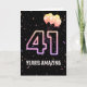 Party balloons and confetti on black background with the neon number 41 for a 41st birthday.