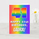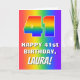 The front of this fun and cheerful birthday themed greeting card design features a large number “41” having a rainbow spectrum inspired gradient pattern. It also features the message “HAPPY 41st BIRTHDAY,”, and a personalized name. The background of the front also has a vibrant multicolored rainbow spectrum gradient pattern. The inside has a customized birthday greeting message, or could perhaps be cleared and left blank if a message is to be written by hand instead. A cheerful, editable birthday greeting card like this might be sent in celebration of somebody’s forty-first birthday. [~Z0000570]