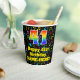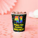 This cheerful and joyful music themed birthday paper cup design features a large number “41” having a rainbow spectrum gradient inspired pattern. It also features the message “Happy 41st Birthday,”, and a personalised name. The background features a vibrant and colourful pattern having music notes and symbols of various colours and sizes. Colourful, vibrant paper cups like this might be fun to have at a birthday celebration being held to celebrate somebody’s 41st birthday. [~Z0000541]