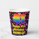 This happy and fun birthday-themed paper cup design features a large number “41” having a rainbow spectrum gradient inspired pattern. It also features the message “Happy 41st Birthday,”, and a customisable name. The background features a pattern of heart shapes with colours like red, pink, and purple. Happy, cheerful paper cups like this might be fun to use at a birthday party/celebration being held to celebrate somebody’s forty first birthday. [~Z0000548]