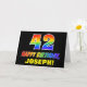 The front of this colorful, fun, and cheerful birthday greeting card design features a large number "42" and the message "HAPPY BIRTHDAY,", both colored with a rainbow spectrum gradient inspired pattern, along with a bold yellow editable recipient name. The front also has a minimalist, plain, black colored background. The inside has a personalized birthday greeting message, or could perhaps be cleared and left blank if a message is to be written by hand instead. A vibrant personalized birthday card like this might be a fun way to acknowledge somebody’s forty second birthday. [~Z0000472]