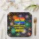 This upbeat and joyful birthday themed paper plate design features a large number “42” with a colourful rainbow spectrum inspired gradient pattern, along with the message “HAPPY 42nd BIRTHDAY,”, and a custom name. The background of the front features an eye-catching, colourful pattern that resembles bursting celebratory fireworks. Exciting birthday themed paper plates like this might be used at a party for somebody who is celebrating their 42nd birthday. [~Z0000604]