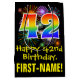This colourful, fun, and exciting birthday gift bag design features a large number "42" with a rainbow spectrum gradient style pattern, along with the message "Happy 42nd Birthday,", and a customisable recipient name. It also features a colourful bursting celebratory fireworks inspired background pattern. A gift bag like this might be used when wrapping gifts being given to somebody in celebration of their forty second birthday. [~Z0000509]