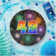 This cheerful, fun, and colourful paper plate design features a large number "42" having a rainbow spectrum gradient inspired pattern colouring. It also features a vibrant and exciting bursting celebratory fireworks inspired pattern. The background is coloured black. Paper plates like this might be fun to use at a party being held to celebrate somebody’s 42nd birthday, a 42nd anniversary, or some other forty second event. [~Z0000490]
