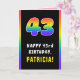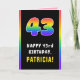 This joyful and fun birthday themed greeting card design features the number “43“ having a multicolored rainbow spectrum inspired gradient pattern, along with the message “HAPPY 43rd BIRTHDAY,”, and a customisable recipient name. The inside has a customised birthday greeting message, or could perhaps be cleared and left blank if a message is to be written by hand instead. A cheerful, customisable birthday greeting card like this might be used to acknowledge somebody’s forty-third birthday. [~Z0000636]