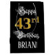This elaborate and ornate birthday gift bag design features the message “Happy 43rd Birthday,”, plus a custom recipient name. Part of the message is in an elegant script-style text, the large number “43rd” features a faux/imitation gold-inspired look pattern, and the background is colored black. A luxurious gift bag like this might be used when wrapping presents being given to somebody in celebration of their 43rd birthday. [~Z0000560]