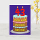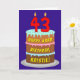 This fun and joyful birthday greeting card design features a depiction of a three-tier birthday cake having number-shaped candles on top showing the age “43“, along with the message “HAPPY 43RD BIRTHDAY,”, and a customisable recipient name. The inside features a personalised birthday greeting message, or could perhaps be cleared and left blank if a message is to be written by hand instead. A cheerful, customised birthday greeting card like this might be used to celebrate somebody’s forty-third birthday. [~Z0000620]
