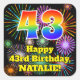 This cheerful and fun birthday-themed square sticker design features a large number “43” having a colourful rainbow spectrum gradient inspired pattern. It also features the message “Happy 43rd Birthday,”, and a customisable name. The background features a colourful bursting celebratory fireworks inspired pattern. Colourful, fun, personalised stickers like this might be given as a birthday present, or used while wrapping gifts, or perhaps used as birthday party decorations when celebrating somebody’s forty third birthday. [~Z0000579]