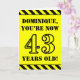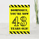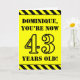 The front of this attention-grabbing and bold birthday-themed greeting card design features a personalised name and the message "YOU’RE NOW 43 YEARS OLD!" in black stencil look text on a yellow coloured background. The front also features an eye-catching yellow and black stripes pattern at the top and bottom edges. The inside features an editable birthday greeting message, or could perhaps be cleared and left blank if a message is to be written by hand instead. A birthday card like this might be a fun way to send birthday wishes to somebody who is celebrating their forty third birthday. [~Z0000413]