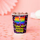 This cheerful and colourful birthday themed paper cup design features a large number “43” having a rainbow spectrum gradient inspired pattern. It also features the message “Happy 43rd Birthday,”, and a custom name. The background features a pattern of purple, red, and pink heart shapes. Loving, upbeat paper cups like this might be fun to have at a birthday celebration being held in celebration of somebody’s forty third birthday. [~Z0000548]
