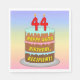 This upbeat and colourful birthday paper napkin design features a cartoon-style depiction of a three-tier birthday cake having number-shaped candles on top showing the age “44“, along with the message “HAPPY 44TH BIRTHDAY,”, and a custom recipient name. The background features a multi-colour pastel rainbow spectrum inspired gradient pattern. Cheerful birthday themed paper napkins like these might be used at a birthday party for somebody who is celebrating their forty fourth birthday. [~Z0000623]