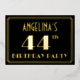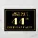 The front of this 1920s/1930s style inspired and vintage-look forty-fourth birthday party/celebration foil invitation features an editable name, a large art deco look inspired number “44th”, the message “BIRTHDAY PARTY”, and a border pattern consisting of lines. The front also features a black-coloured background by default, but it can be customised to a different colour if desired. The back features personalised details about the event, such as the date, time, venue, and any other important information. Elegant, luxurious, editable invitations like these might be used to invite guests to a birthday party being held to honour somebody’s 44th birthday. [~Z0000591]