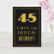 The front of this vintage look and 1920s/1930s style inspired birthday greeting card design features a large art deco look inspired number "45", the message "HAPPY 45th BIRTHDAY,", a customisable name, and a border pattern consisting of lines. The front also features a black-coloured background. The inside features a personalised birthday greeting message, or could perhaps be cleared and left blank if a message is to be written by hand instead. A custom birthday card like this might be a fun way to send birthday wishes to somebody who is celebrating their forty fifth birthday. [~Z0000502]