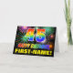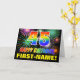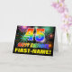 The front of this colourful, fun, and cheerful birthday greeting card design features a large number "45" and the message "HAPPY BIRTHDAY,", both having a rainbow spectrum gradient inspired pattern colouring, along with a bold yellow personalised recipient name. The front also features a multicolored background pattern inspired by bursting celebratory fireworks. The inside features an editable birthday greeting message, or could perhaps be cleared and left blank if a message is to be written by hand instead. A colourful personalised birthday card like this might be a fun way to acknowledge somebody’s forty fifth birthday. [~Z0000471]