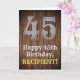 This western look and country look birthday-themed greeting card design features a large rustic look number "45", the message "Happy 45th Birthday,", a personalised name, and a faux/imitation wood grain inspired look pattern background. The inside has a custom birthday greeting message, or could perhaps be cleared and left blank if a message is to be written by hand instead. A customisable birthday greeting card like this might be used to celebrate somebody’s forty-fifth birthday. [~Z0000469]