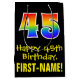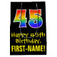This fun, colourful, and exciting birthday gift bag design features a large number "45" with a rainbow spectrum gradient style pattern, along with the message "Happy 45th Birthday,", and a personalised recipient name. It also has a black-coloured background. A birthday themed gift bag like this might be a fun way to wrap a gift or present being given to celebrate somebody’s 45th birthday. [~Z0000512]