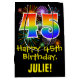 This fun, exciting, and colourful birthday-themed giftbag design features a large number "45" with a rainbow spectrum gradient style pattern, along with the message "Happy 45th Birthday,", and an editable recipient name. It also has a colourful bursting celebratory fireworks inspired background pattern. A giftbag like this might be used when wrapping gifts being given to somebody in celebration of their 45th birthday. [~Z0000509]