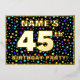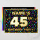 The front of this upbeat forty-fifth birthday party/celebration foil invitation card design features an editable name, a large number “45th”, the message “BIRTHDAY PARTY!”, and a border. The background of the front features an exciting, multicolored pattern of star shapes. The back features personalised details about the event, such as the date, time, location/venue, and any other useful information. Editable invitations like these might be a fun way to invite attendees/guests to a birthday gathering being held to honour somebody’s 45th birthday. [~Z0000600]