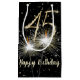 Gold sparkler on black background with gold confetti for 45th birthday.