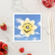 White flower graphic with glowing sunshine, smile, and eyeballs on a blue summer sky background for a 45th birthday party.