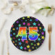 This colourful, fun, and cheerful paper plate design features a large number "45" containing a rainbow spectrum gradient inspired pattern colouring. The background features a colourful star shapes pattern. Fun paper plates like this might be used at somebody’s 45th birthday celebration, or a couple’s forty fifth anniversary party, or some other 45th event. [~Z0000493]