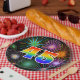 This fun, cheerful, and colourful paper plate design features a large number "45" coloured with a rainbow spectrum gradient inspired pattern. It also features a vibrant and exciting bursting celebratory fireworks inspired pattern. It has a black coloured background. Fun paper plates like this might be used at somebody’s forty fifth birthday party, a forty fifth anniversary celebration, or some other forty fifth event. [~Z0000490]