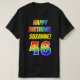 The front of this colourful, vibrant, and exciting birthday themed shirt design features a large number "46" and the message "HAPPY BIRTHDAY,", both having a rainbow spectrum gradient inspired pattern colouring, along with a bold yellow custom name. Cheerful and bold birthday-themed shirts like this might be fun for the guests at somebody’s forty sixth birthday party and celebration to wear. [~Z0000473]