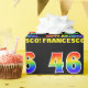 This cheerful, colourful, and fun birthday themed wrapping paper design features a large number "46" and the message "HAPPY BIRTHDAY,", both having a rainbow spectrum gradient inspired pattern colouring, along with a bold yellow customisable recipient name. The background is coloured black. Fun wrapping paper like this could be used when wrapping a birthday present or gift being given to somebody who is celebrating their forty sixth birthday. [~Z0000475]