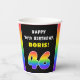 This fun and joyful birthday paper cup design features the number “46“ with a multicolor rainbow spectrum inspired gradient pattern, along with the message “HAPPY 46th BIRTHDAY,”, and an editable recipient name. Paper cups like this might be used when celebrating somebody’s forty sixth birthday. [~Z0000639]